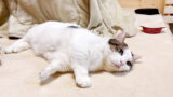 コタツから出てきてポテっと転がる猫